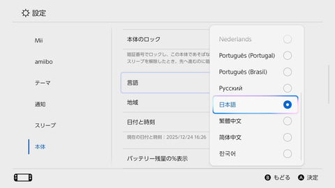 その2:本体言語は「日本語」のみ。ゲームによっては言語を選べることも(Switch2/PS5)