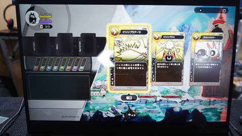 そしてバトルシステムは前述したとおり、リズムゲームとして展開する。画面下方にリズムゲームのゲージがあり、縦のラインが左から右へ動いていく。このラインがゲージのラインと重なるタイミングで、特定のボタンを押すことでコブンに指示を出せる。