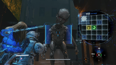 趙氏:基本的にシューターとハッキングを一緒に戦闘の中でやるっていうコンセプト自体は割と当初からありまして、理由としては普通のシューターや既存のアクションゲームとそんなに差別化ができないっていうのと、個人としてはもっとSF感を出すために銃以外にも何かアクションが欲しいなと思っていて、1つの戦闘の中で戦略的にもう1つ何か操作が入ると面白いのかなと思いまして、「じゃあ、ハッキングって何をしたらハッキングなの?」っていうところからいろいろなハッキングの遊びがガッチャンコされたり、捨てたりとかをして今のハッキングの形になったって感じですね。