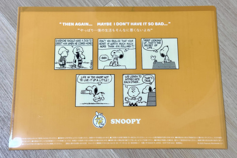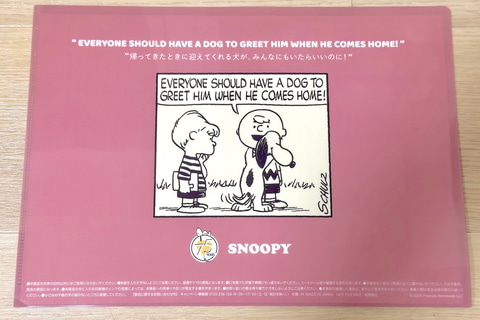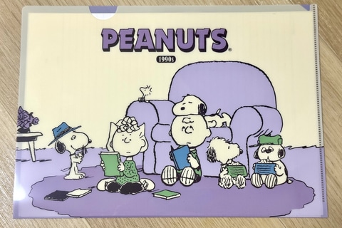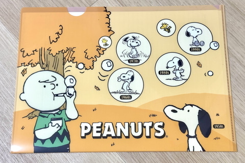 クリアファイル表面には、1950年代から2000年までの各年代のアートを使用。裏面には各年代の名言があしらわれており、時代ごとのスヌーピーや仲間たちの魅力、スヌーピー75年の歴史が楽しめる。