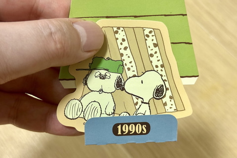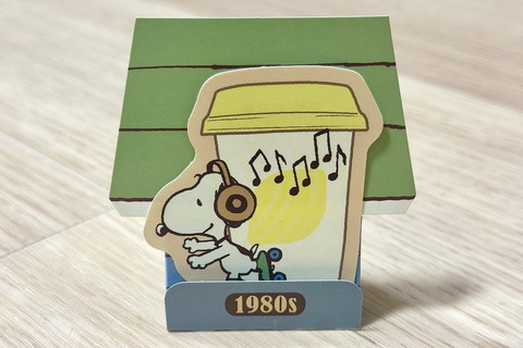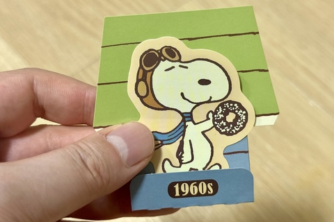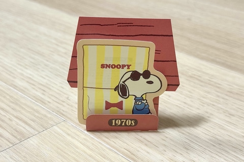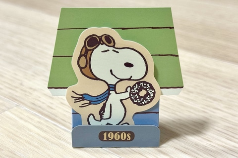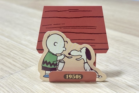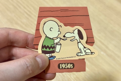 「PEANUTS」コミック誕生から50年間の各年代のアートを使用したスペシャルステッカーが登場。一緒に入っているスヌーピーの小屋の台紙を組み立てて飾ることもできる。
