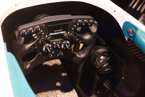 「Honda eMS SIM-01」のモノコック部分はカーボンで作られており、それを振動させることでリアルな感覚が伝わってくる。スピーカーはコックピットの前後左右に配置されており、6.2chサラウンドのリアルなサウンドを表現。さらに、ロードノイズやウインドノイズなどの低周波の音を出すために、サイドポンツーン部分にサブウーハーが内蔵されており、音がモノコックを破って伝わってくるような作りになっている。