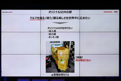 同社では、Honda Racing eMS主催イベントとして、2023年から「グランツーリスモ7」を使った世界大会をオンラインで開催している。こちらは世界70ヵ国、20万人以上を集客するというかなり大規模なイベントに成長してきた。そうした中で、長年夢見てきたのが、オリジナルのシミュレーターを作りたいということであった。しかし、実際に原理証明モデルを作ってみたところ、何か物足りなさがあった。そこで中でもこだわったのが、没入感と迫力感、ホンモノ感という3つの要素である。