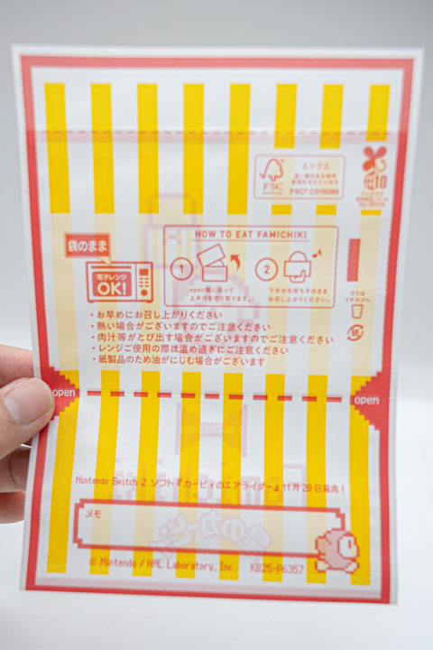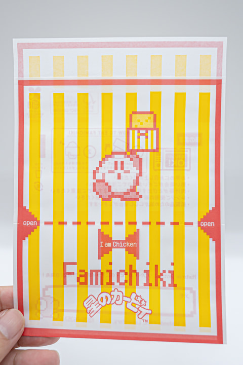 ファミリーマートの顔といっても過言ではないホットスナック・ファミチキの袋もオリジナルデザインとなっている。全2種のデザインは懐かしいドット絵で、ゲットしたファミチキを掲げるカービィと、複数のファミチキを吸い込む姿のカービィという、どちらもカービィらしさを感じることができる仕上がりになっている。