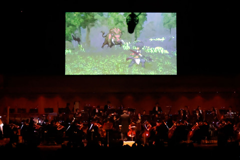 単純にシリーズのナンバリングタイトルを順番に演奏していくというわけではなく、少しひねりを加えたプログラムになっていたのもユニークだ。だが、それよりも感心させられたのはオーケストラの楽団が演奏している上部に大きなスクリーンが設置されており、楽曲の演奏に合わせてそちらでゲーム中の場面も同時に流されていたことであった。