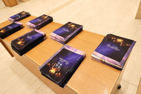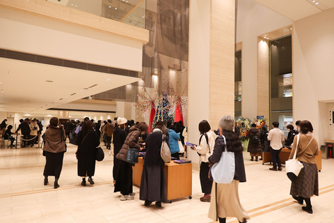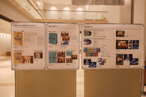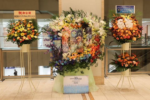 会場内のロビーに入ると、入り口付近にチラシが入れられたクリアファイルが配られていたほか、公演パンフレットやCDなどが購入できる物販コーナーも用意されていた。その合間に大きな花束が飾られており、こちらも訪れたファンの多くが写真を撮っている様子が見られた。
