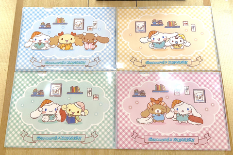 クリアファイルは全4種。デザインは本コラボのための描き下ろしとなっており、お寿司をイメージした衣装を着用したシナモロールたちがかわいく描かれている。
