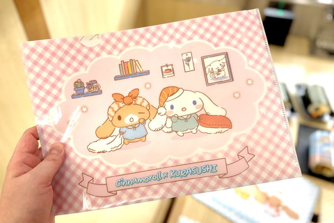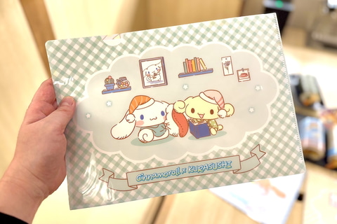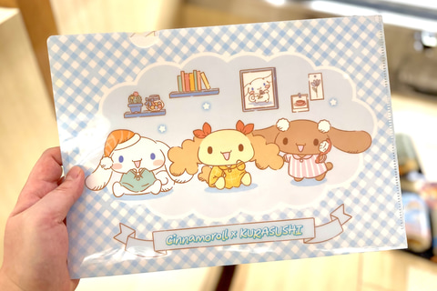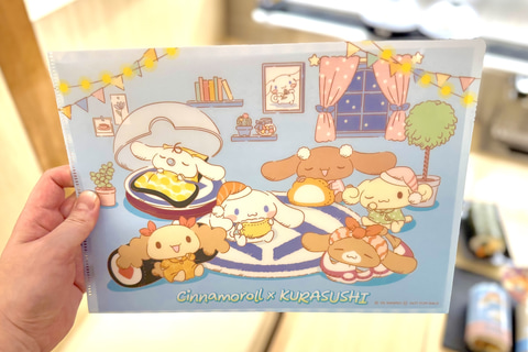 コラボ期間中、くら寿司にて2,500円のお会計ごとにシナモロールたちがデザインされた景品が貰えるプレゼントキャンペーンが実施される。プレゼントキャンペーンは計2回に渡って開催。今回は1月9日からの第1弾景品「クリアファイル」が先行でお披露目された。