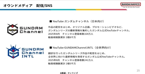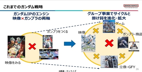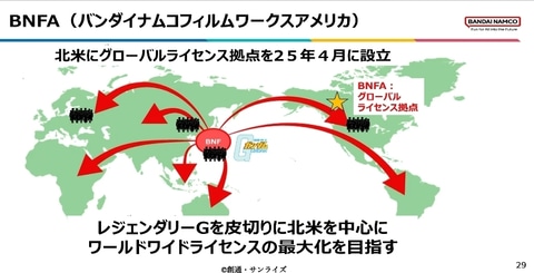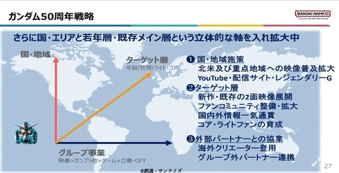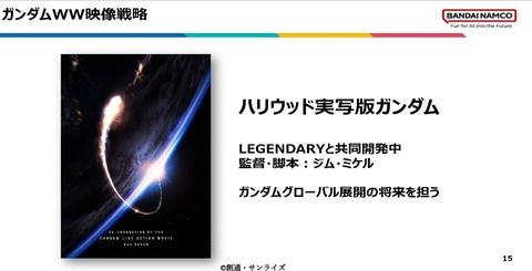 『ガンダム』の最大の課題は『北米・欧州での認知不足』。アジアでは強いものの、海外では日本ロボットアニメ特有のハードルがある。そこで現在、ハリウッドのレジェンダリーと実写版ガンダムを開発中。これを『グローバル強化の起点』と位置づけている。