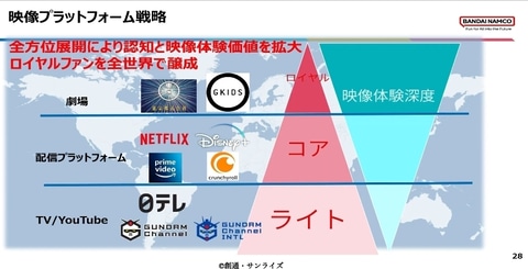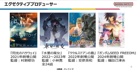 まず劇場作品は、30~50代の従来ファン向けとし、『ガンダムSEED FREEDOM』や『閃光のハサウェイ』などは「大人のガンダム」。ファンの期待に応える重厚路線を維持する。