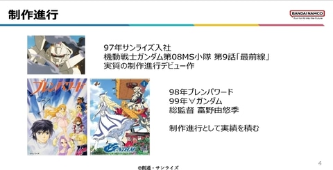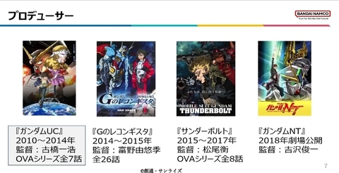 また、他社との連携として新作劇場版『シティーハンター』等にも携わる。これは「他社のトレンドを吸収し、ガンダムの思考が凝り固まらないようにするリフレッシュ兼修行」だと語った。