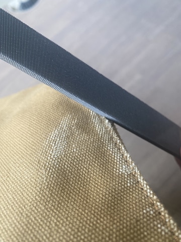 全体を程よくヤスリ掛けしたら、今度は好みの場所を集中的に削ってボロボロにしていく。というのも、全体を軽くヤスリ掛けをしただけだと、「ただ長く使っているだけ」というようにも見える。そのため「ハードに使われてきた感」を演出するために先ほどよりもガッツリと削っていく。
