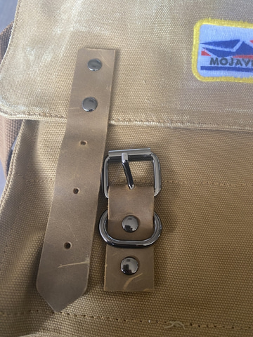 正面上蓋の真ん中には「Mojave Express」のワッペンが裁縫されており、その両脇にはレザーベルトが留め具として取り付けられている。布や金具、レザーにいたるまでいずれも品質が高く、買ってそのまま私生活で使えると思う。