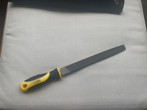 ウェザリングで最初にするのは、全体を軽くヤスリで削っていくこと。買ったままの状態は新品のため当然かなりきれいだ。そのため、まずは全体をヤスリ掛けして“使い古した感じ”を出すのがいいと思う。筆者の場合はよく擦れそうな各種角や上蓋、ベルトと留め具などを意識的に削っていった。