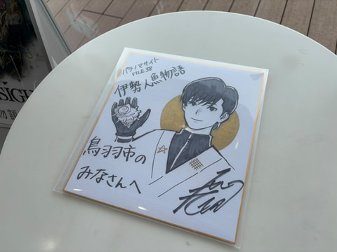 記者発表会ではサイン入りポスターの贈呈式も実施。奥州氏をはじめとした主要メンバー4名のサインが書かれた大きなポスターの受け渡しが行なわれた。これに加え、小林元氏のサイン色紙も贈呈。主人公の勇佐が描かれた世界に1枚の色紙となっている。なお、ポスターは展示される予定で、サイン色紙については今のところ市長室に置く予定とのこと。