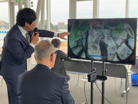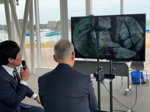 イベントの最後にはサプライズとして市長による実機プレイがお披露目された。今回本作を初挑戦するという市長は、Joy-Conを手に本作の素潜りをプレイ。本作は基本的にポイント・アンド・クリックのアドベンチャーゲームとなっているが、この素潜りはややアクション性のある要素で、主人公の一人称視点で海に潜り、海中の海産物を取る遊びが楽しめる。