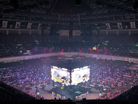 今年のステージは高さがかなり抑えられており、アリーナ席が撤廃になった代わりに、升席のスペースがかなり増加している。これにより、最前列の升席はステージとかなり近い位置になっており、試合中の選手たちの様子がかなりはっきりと見えるようになった印象だ。