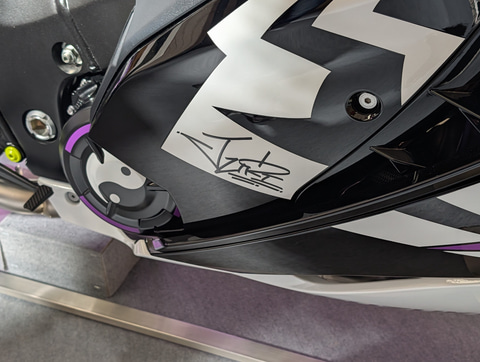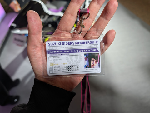 そして、今回もスズキのブースが激熱だ。すでにニュースリリースが出ているが、なんと会場では初お披露目となる、「スト6」コラボバイクの第2弾「Hayabusa Tuned by JURI」が展示されているのだ。カスタム元のバイクはスズキの「GSX1300R ハヤブサ」。オリジナルでも漢字の「隼」ロゴがめちゃくちゃカッコいいイメージが残っているが、今回のコラボバイクについても、ジュリらしい紫色の「隼」ロゴがクールでいい味を出している。同社によると、ジュリの2Pカラーの白と黒、黄色をダイナミックに配色し、ジュリの「もう1つの姿」を表現したという。