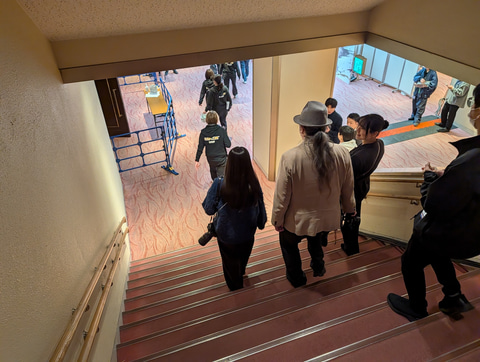 当選者が集まりツアーがスタート。最初に特定のパスを持つ人しか入れない扉をくぐり抜けると、そこは地下へと続く階段だった。選手控室は地下のスペースが当てられており、ここで出場前の選手たちが待機したり、練習したりしているようだ。