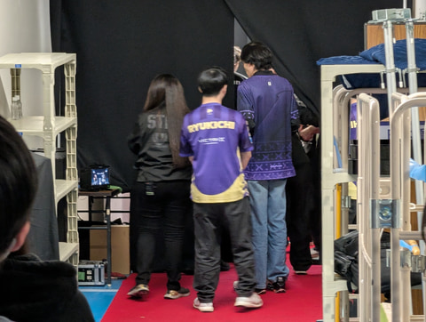 ツアーは選手控室の脇を一旦抜けて、レッドカーペットの選手入場口の裏側まで向かう。ここでは入場を控えた選手たちの様子が確認できるようになっている。タイミングがあえばより多くの選手が見られるかもしれない。筆者たちが同行したタイミングではりゅうきち選手の入場前の姿が確認できた。