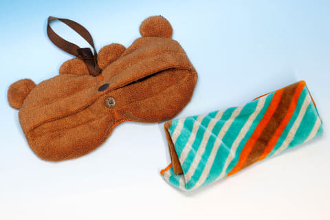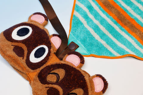 まず「タオルインポーチ」だが、こちらはポーチ部分がまめきちとつぶきちをフィーチャーしたようなデザインが採用されている。ぱっと見は何か分かりにくいところも面白い。このポーチの背面側にボタンが付けられており、その中にタオルが入れられているという作りだ。