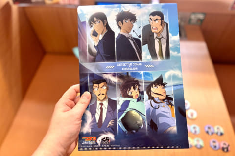 コラボ期間中、くら寿司にて2,500円のお会計ごとにアニメ「名探偵コナン」のキャラクターたちがデザインされた景品がもらえるプレゼントキャンペーンが実施される。プレゼントキャンペーンは計3回にわたって開催。今回は4月3日からの第1弾景品「A4 クリアファイル」が先行でお披露目された。