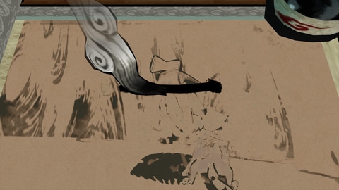 最も多用し、最もテンションが上がるのが、対象を真っ二つに切り裂く「一閃」である。横にサッと線を引く。ただそれだけの動作で、行く手を阻む大岩が両断され、襲い来る妖怪たちが真っ二つに裂ける。筆が走った瞬間のシャキンとした効果音と、ズバッと物が切れる手触り感は、何度やっても飽きることがない。
