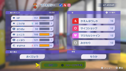 そんな「メガマフォクシー」の育成例だが、まず能力補正を「おくびょう(すばやさアップ・こうげきダウン)」にし、とくこうとすばやさにポイントを振った型が最も強みがわかりやすい。技はタイプ一致の「かえんほうしゃ」と「サイコキネシス(とくぼうが高いポケモンを意識するなら「サイコショック」)」をメインウェポンに、残り2枠を「マジカルシャイン」などのサブウェポンや、「アンコール」などの絡め手、「わるだくみ」のようなステータスを上げる技から選択する形だ。