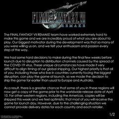 これは新型コロナウイルス感染症の影響により、各国に対する船便着荷の時期が不透明になっている状況を鑑みたもの。4月10日の世界同時発売日までにソフトを販売店に届けるための特例対応となる。また、開発チームは「『FFVII REMAKE』は沢山の驚きに満ちた新しいゲーム」であり、世界中のプレーヤーが同じ驚きを味わえるよう、仮に先行して入手した場合でもネタバレは避けて欲しいとした。