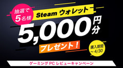 サードウエーブは、PC専門店ドスパラにおいて、「GALLERIAレビュー投稿でSteamウォレットプレゼントキャンペーン」を4月9日より開催する。