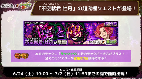これは、本日6月22日に放送された配信番組「モンストニュース」にて発表されたもの。6月24日より開催されるガチャ「超・獣神祭」にコラボキャラクタ―「画眉丸」や「山田浅ェ門 佐切」、「賊王 亜左弔兵衛」が登場する。そのほかにも、超究極クエスト「牡丹」が6月24日19時より随時開催されるほか、ログインプレゼントも実施される。