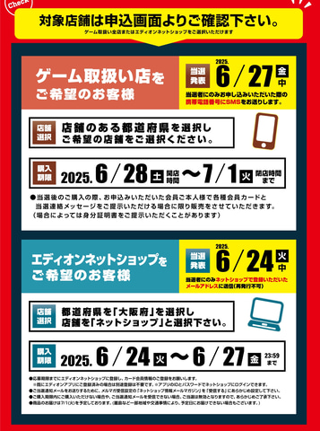 受け取りはゲーム取扱店またはエディオンネットショップを選択可能。当選発表はネットショップが6月24日中、ゲーム取扱店が6月27日中となっている。