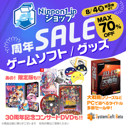 日本一ソフトウェアは、「日本一ソフトウェア周年セール」を通販サイト「Nippon1.jpショップ」にて実施している。期間は8月4日9時まで。