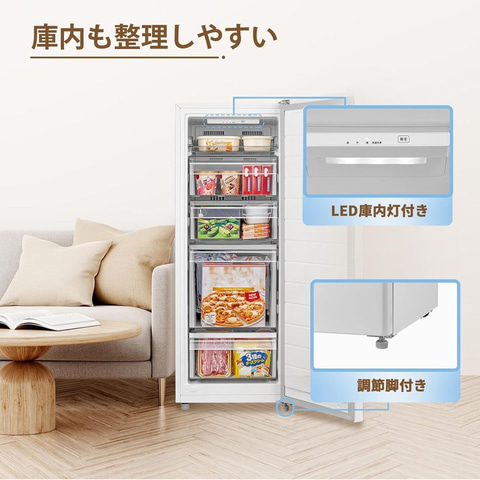 本商品は、135Lの大容量ファン式冷凍庫。5段の仕切りが装備されており、さまざまな食材や物品を分類して収納することができる。前開き式&クリアトレータイプ。直立式の設計を採用しているため、保管されているものは取りやすく、整理しやすい。庫内に冷気を循環させて冷却することで、自動で霜取りを行なう。また、省エネ技術を採用しており、運転時の消費電力が低く、環境に優しく電気代も節約できる。