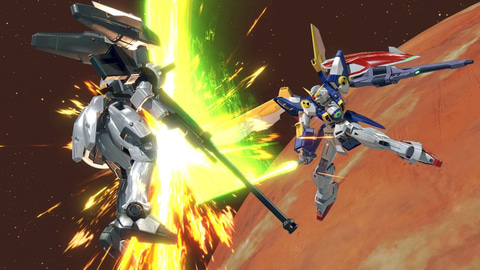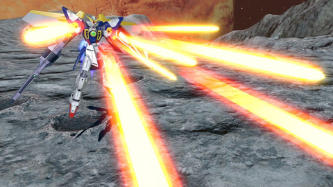 「ウイングガンダム」は、「新機動戦記ガンダムW」に登場するヒイロ・ユイがパイロットを務めるMS。本作では、高出力のバスターライフルを携え、バード形態で敵機に強襲を仕掛ける2,000コストの万能機となっている。メイン射撃は、バスターライフルから照射ビームを発射する。さらに、メイン射撃をチャージすることで、次のバスターライフルを使用する攻撃が強化される。