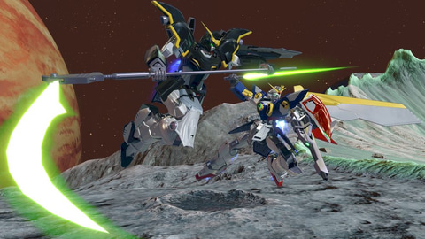 また特殊射撃では、デュオが駆る「ガンダムデスサイズ」が、レバー入力の有無で2種類の異なる援護を行なう。ビームサイズを用いた格闘攻撃を行なう「ガンダムデスサイズ」と連携し、敵機を追い詰めることができる。特殊格闘では、バード形態へ変形し、敵機に向かって突撃する。アクション中にのみ行なえる多彩な技を使いこなし、真正面から急襲しよう。
