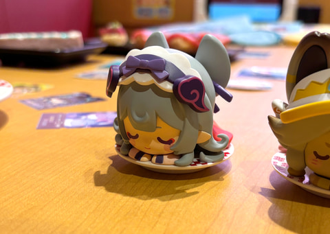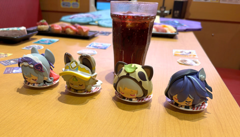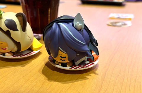 これに加えて「観月の宴 原神コラボ限定ミニフィギュア付き ソフトドリンク」も提供。価格が1,400円よりとやや値が張る商品にはなるが、こちらは対象のドリンクとともにランダムでミニフィギュア1つがセットになっている。スヤスヤ眠っているかのような姿を立体化した商品で、思わず癒やされる可愛さだった。よく見るとお寿司のお皿の上にちょこんと乗っており、制作者のこだわりを感じるグッズとなっている。