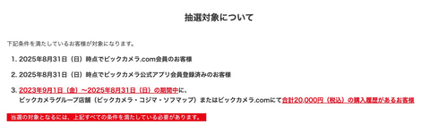 抽選に応募できるのは、2025年8月31日時点でビックカメラ.comおよびビックカメラ公式アプリの会員になっている人。また、2023年9月1日~2025年8月31日の期間中にビックカメラグループ店舗(ビックカメラ・コジマ・ソフマップ)またはビックカメラ.comにて合計20,000円の購入履歴がある人が対象となる。