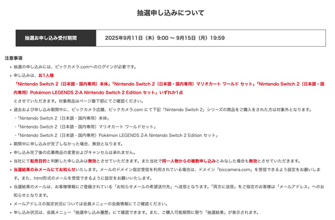 今回の抽選は「ポケモンレジェンズZAセット」のほか、Switch2本体単品、「Switch2 マリオカート ワールド セット」についても同時案内。申し込みは1人につきいずれか1点のみとなっており、過去および申し込み期間中にビックカメラ店舗、ビックカメラ.comにて下記「Nintendo Switch 2」シリーズの商品を購入している人は対象外となる。