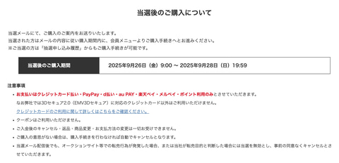 抽選結果発表は9月25日17時以降。当選者は9月26日9時から9月28日19時59分の期間で商品を購入できる。