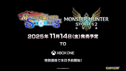 カプコンは、「モンスターハンター ストーリーズ」及び「モンスターハンターストーリーズ2 ~破滅の翼~」をXbox one向けに11月14日に発売する。