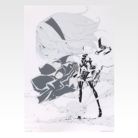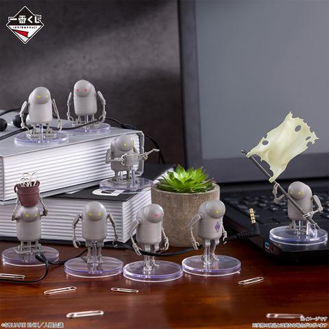 他にも、「NieR:Automata Ver1.1a」のキービジュアルイラストを使用したクリアポスターやガラスプレート、「NieR:Automata Ver1.1a」の名場面を切り取ったデザインのクリアファイルセット、機械生命体のフィギュアなどが登場。最後の1個引くともらえるラストワン賞には、A2を約20cmで再現したアートスケールフィギュアが用意されている。