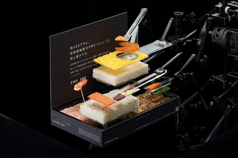 「食べられるパソコン」を謳う商品で、中身は「パソコンの重さに関する実態調査」の結果を食材で表現し、食べるのはもちろん、見ても楽しめるお弁当となっている。箱にはFMVやintelのロゴがあしらわれているなど、ユニークなお弁当に仕上がっている。