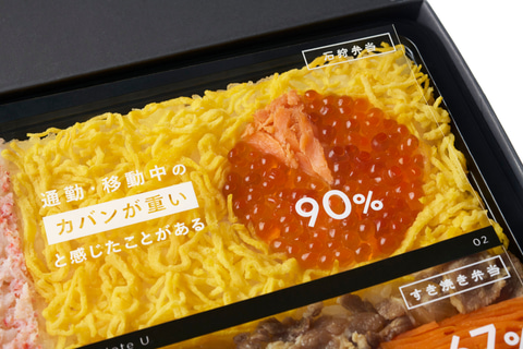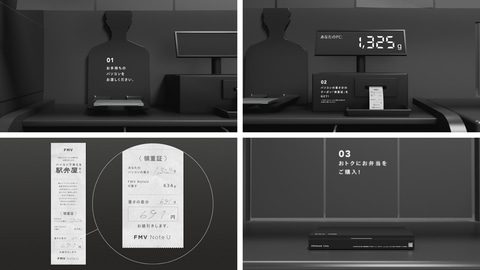 「FMVentoU」はFCCLが開発・製造・販売する世界最軽量約634gのノートパソコン「FMV Note U(UX-K3)」と同じ重さのお弁当。FCCLが実施した「パソコンの重さに関する実態調査」によると、多くのビジネスパーソンがカバンの重さに大きなストレスを感じており、荷物が軽ければ仕事の効率も上がると感じていることが明らかになったという。その重さの主な原因がPCにあり、荷物を軽量化し通勤や出張などの移動を快適に過ごしてほしい想いを込めて、「FMVentoU」の開発に至った。