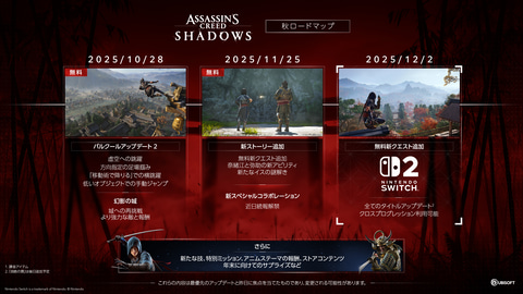 Switch2版「アサシン クリード シャドウズ」では、ゲーム発売以降に導入された全コンテンツアップデートが含まれており、Ubisoft Connectを通じて全プラットフォーム間でのクロスプログレッションに対応。Switch2の全プレイモードに対応し、タッチスクリーンによるメニューやマップ、隠れ家の操作も可能となっている。