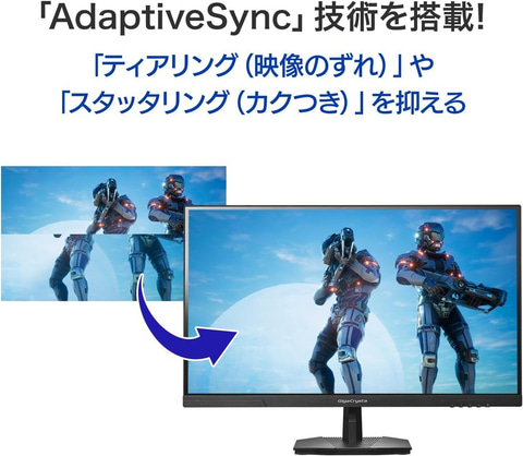 本商品は、WQHD(2,560×1,440)対応となり、フルHDと比べて約1.8倍ゲームを繊細に表示することが可能、かつ最大275Hzの高速リフレッシュレートに対応したゲーミングモニター。FPSなどにおいては敵の視認性向上、追従性向上に役立つ。また可変リフレッシュレート技術である「AdaptiveSync技術」を搭載し。最大275Hzをサポートし、可変リフレッシュレートにより「ティアリング(映像のズレ)」や「スタッタリング(カクつき)」を抑え、快適にゲームをプレイすることができる。