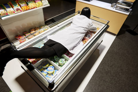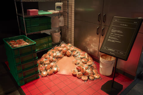「炎上展」は「バズりたい。けど、燃えたくない。」をテーマに、炎上をモチーフとした展示を行なっている。アイスケースや大量のバンズの上に寝そべったり、おでんを指でつついたりする風景を撮影できる。