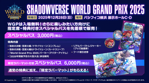 「Shadowverse World Grand Prix 2025 Grand Finals」は入場無料だが、さらに大会を楽しみたい人向けに、指定席・特典付きスペシャルパスが販売される。