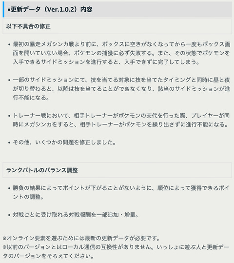 今回の更新データの内容は、最初の暴走メガシンカ戦より前に、ボックスに空きがなくなってから一度もボックス画面を開いていない場合、ポケモンの捕獲に必ず失敗する不具合などを修正するといったもの。