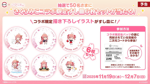 また、缶バッジの袋には二次元コードが記載されており、コードにアクセスして応募することで、抽選で50名にコラボ限定すし皿6枚セットが当たるキャンペーンが実施される。応募期間は11月19日より12月7日まで。